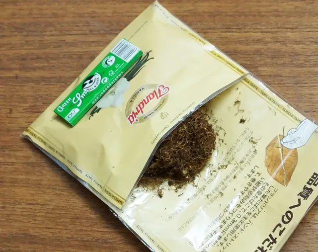 ややチープな印象もあるパッケージをめくり、シャグの香りを嗅いでみると、まろやかなバニラの香料の香りがある一、たばこ葉の苦味、酸味、辛味のような香りもしました。