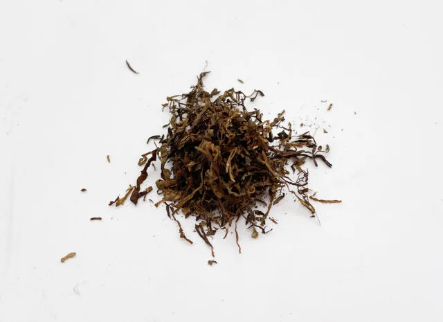 強い粘度を感じる黄色い葉と焦茶の葉が入り組んでおり、いずれもシャグ特有の細かい刻み幅(0.3〜0.6ミリ)です。触ってみると、強い粘度が指先につく感じで、ファイヤーキュアード(火力乾燥)されているような印象を受けました。
