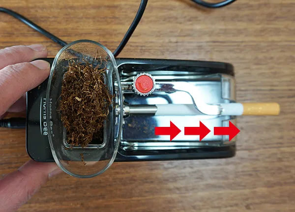 ③電源を入れる。チューブを優しく抑えると、写真上の赤矢印のように徐々にシャグがチューブ内に注入され、チューブが押し出される