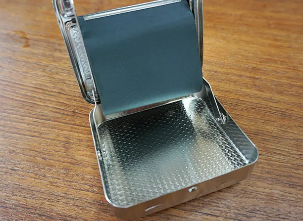 ①ローリング・ボックスの蓋を開ける。箱の受け側はシャグの保存用、蓋側がロール機能を持つものになる