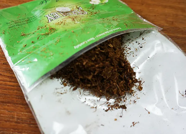 香料ムラが出ないよう、ゴワゴワの葉をまんべんなくほぐした後、クルクル巻いて吸ってみます。