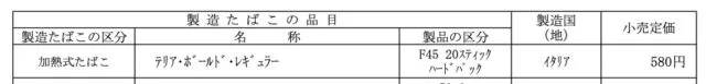 たばこの販売を管轄する財務省HPで発表されたのは、テリアボールドレギュラーという新銘柄。