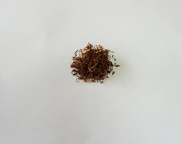刻みの細かい濃い茶色の葉に入り混じる木の葉のような破片が見えますが、指で触れた感じではいずれにしても粘度強め。