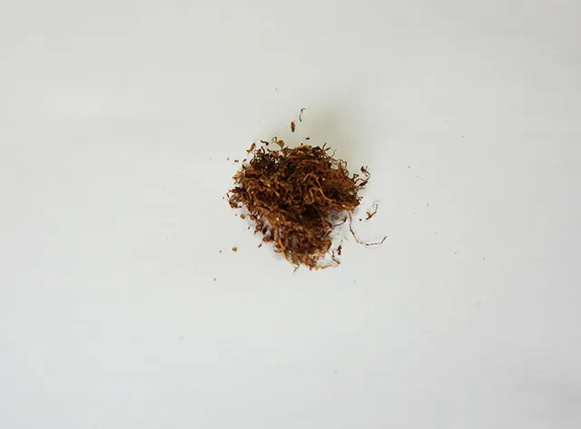 刻みの細かいバージニア葉が縮れながら入り組んでおり、その細かい葉に混じって、黄土色の大振りのたばこ葉の破片が散見されます。