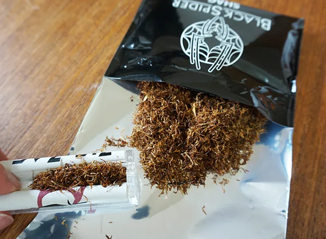 あくまでも目視での推測ですが、ブラックスパイダーシリーズのフレーバー系のシャグの中では特徴的な葉を使っているのではないかという印象を抱きました。