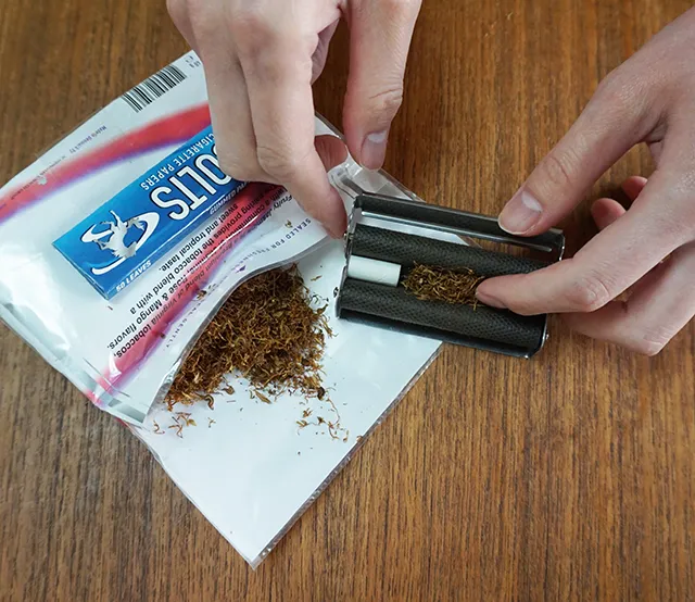 前述の通り、香料の湿度が高いたばこ葉を手巻きして火をつけて吸ってみます。