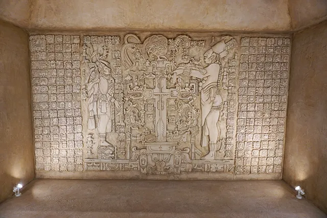 ↑パレンケ遺跡の「十字の神殿」の内陣に描かれたレリーフ(展示用に再現したもの)[/caption]