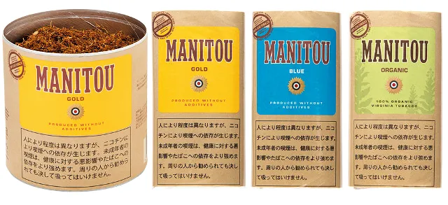 ↑三井社長が推薦してくださったブレンドする際のベースとしてお勧めのシャグ・マニトウシリーズ。いずれもバージニア葉をベースとし香料を使っていないもの。左がゴールド缶、80g入り、2320円(税込)。右の3種がそれぞれゴールド、ブルー、オーガニック、各30g入り、880円(税込)[/caption]